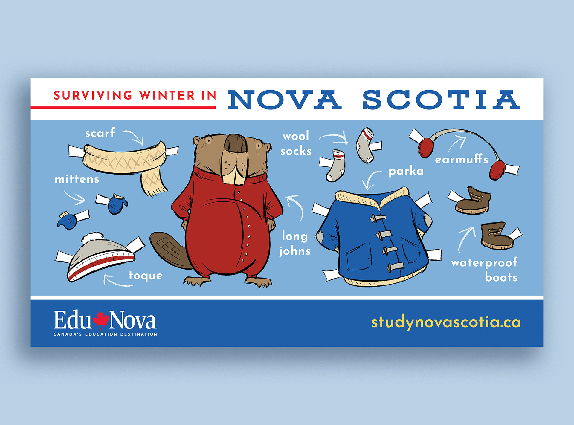 This social media campaign was developed for EduNova, a co-operative industry association of education and training providers in Nova Scotia, Canada. These ads, featured on the organization’s Facebook, Twitter and Instagram profiles, were created to recruit international students to pursue post-secondary education in Atlantic Canada. The beaver mascot was adapted across multiple pieces as a unifying visual element, and a light-hearted way to introduce unique aspects of Canada’s Maritime culture and landscape to young people overseas.